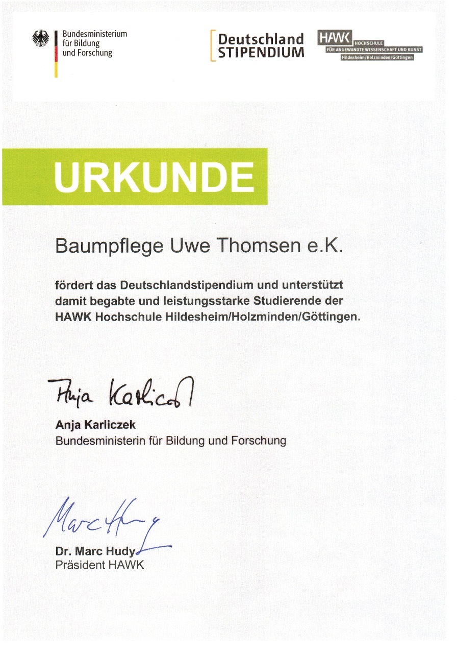 Die Baumpflege Thomsen fördert seit 2016 Studierende zwecks erreichen des Masterabschlusses, hier Aboristik in Göttingen.